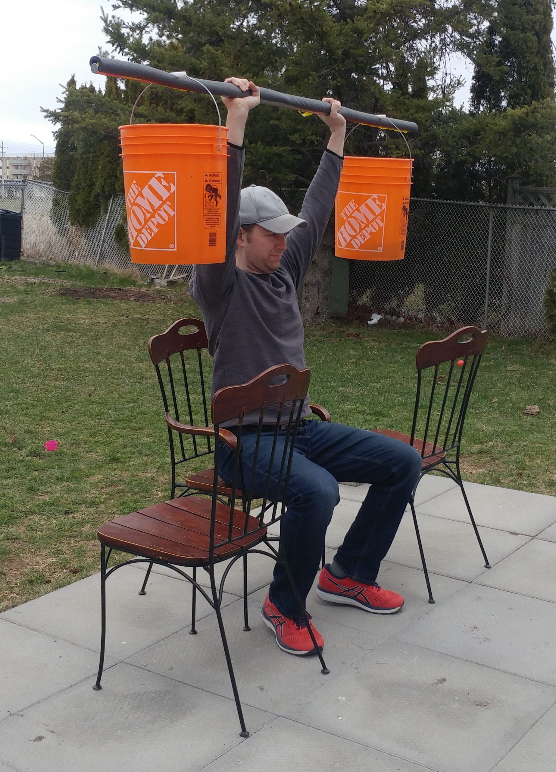 Squats: Since we don’t have squat rack, we’ll have to get inventive. Get three of your kitchen chairs. Put them somewhere flat outside, in a row, and approximately 2 feet apart, facing you. Put your loaded up orange buckets on each outer chair. Get your rebar positioned under each bucket handle. Sit in the middle chair and get the rebar onto your back. If the bar is too low to get onto your back at this point, you will need to increase the height of the buckets further.